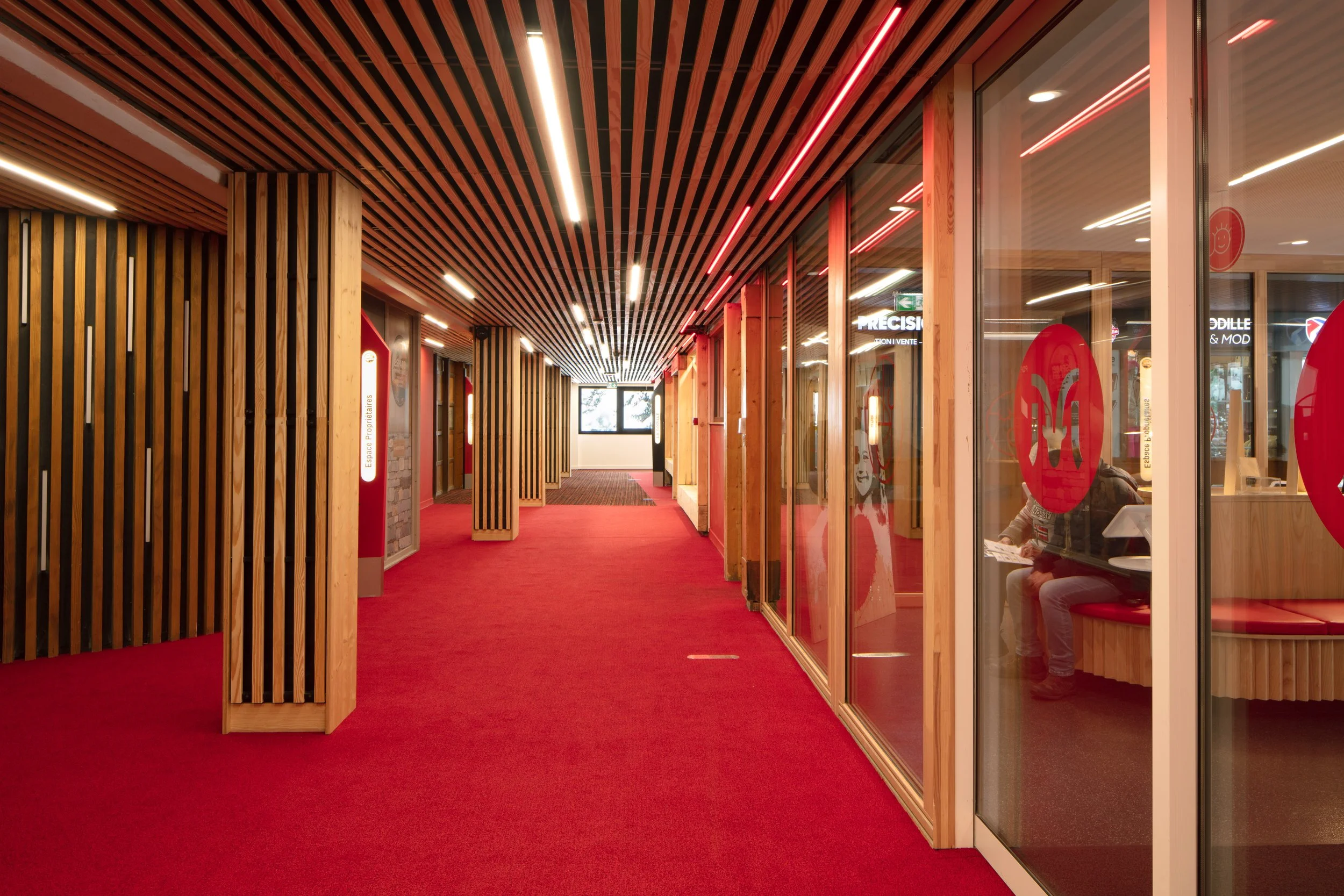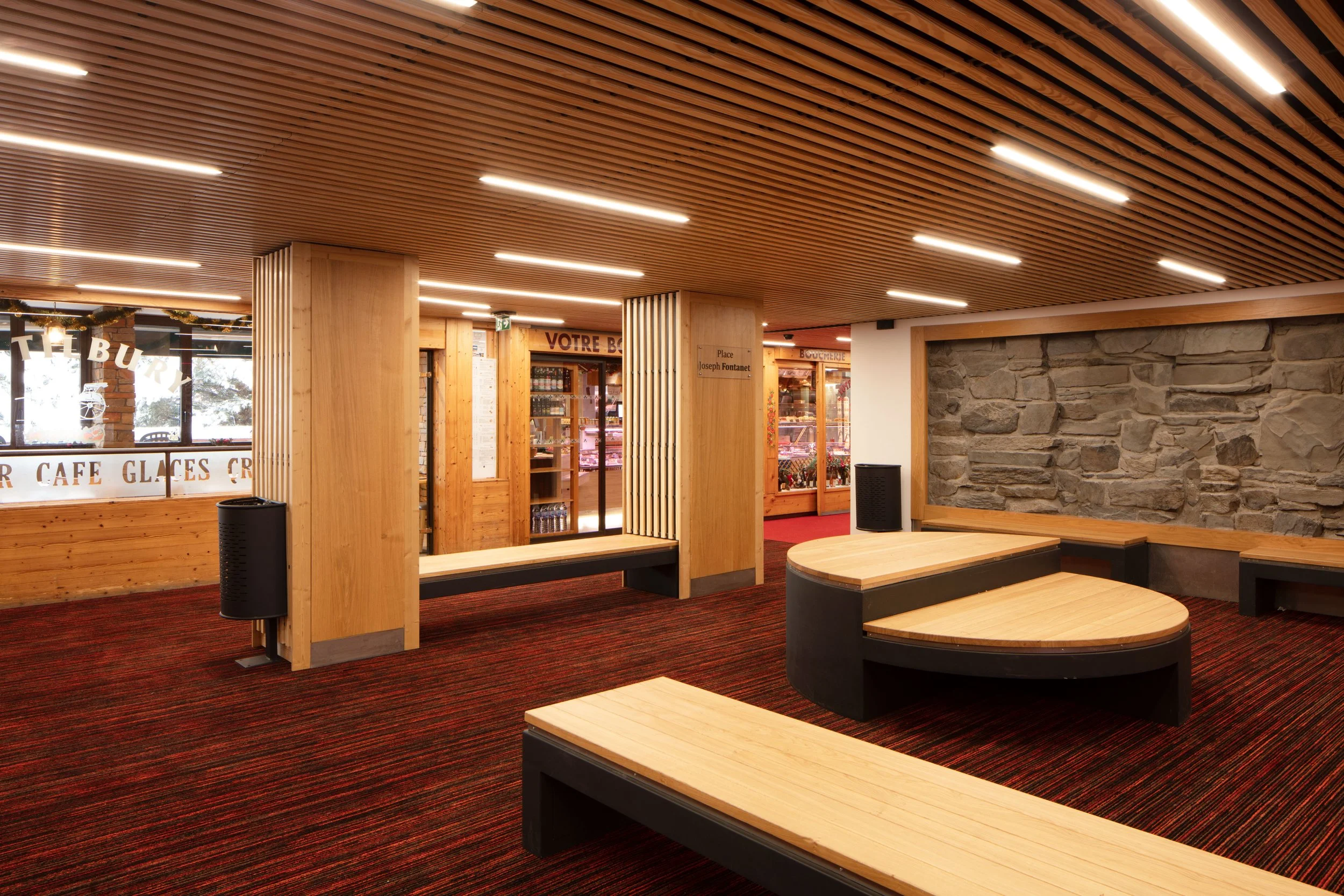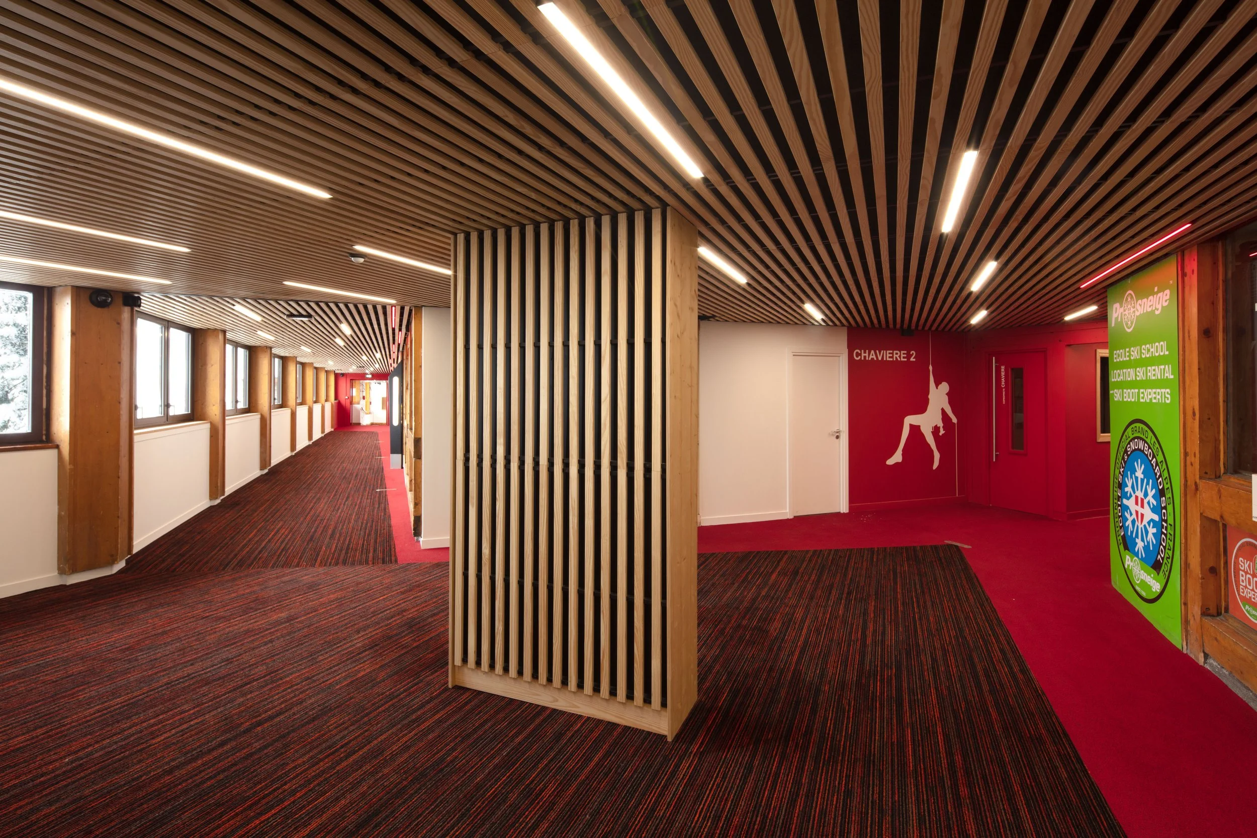 En architecture, le tout est à la partie ce que la partie est au tout : on n’apporte pas une solution, mais un processus qui résout l’ensemble des problèmes. Dans le cas de La Croisette, la signalétique doit aussi aider à résoudre le problème de l’orientation par exemple. C’est pourquoi j’ai proposé un processus global basé sur un travail du sol et du plafond. Ces deux plans qui se font face – au sens propre comme au figuré - sont les clefs de voûte de l’orientation. Nous les avons mis en valeur en jouant sur les couleurs et les matières : au sol, le dynamique rouge, ADN de la marque "friendlyMenuires" a été choisi pour le tapis grand trafic et grand confort anti-glissant et acoustique ; au plafond, isolé et ajouré, c’est le noir qui fait ressortir les carrelets de bois alpin - donc biosourcé ! - dans lesquels sont insérés des luminaires façon étoiles filantes.